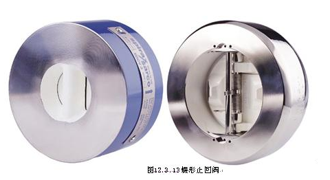 蝶形止回閥或雙盤式止回閥克服了擺動式及碟片式止回閥的口徑和壓降限制,懸啟式止回閥的閥瓣被 一分為二,在中間鉸接。這樣兩個碟片只能在一個方向擺動,碟片靠裝在鉸鏈上的紐彈簧壓在閥座上。 為了能在流道中心有一個鉸鏈,需在外面安裝一個固定銷,這樣就會引起閥門的泄漏,設計改進后 可在里面安裝,流體就可以密封在閥體內部,不會泄漏到外面(見圖12.3.13)。