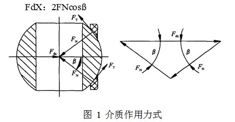 由于閥座和殼體不是粘接密封而是壓縮密封,因此出口端閥座軸向總密封力FMZ應(yīng)由閥座軸向動(dòng)密封力FdX和靜密封力FJX合成。文獻(xiàn)[ 1 ]推薦FMZ :FNC0,其值得推敲,F(xiàn)N是FMZ分力,應(yīng)小于FMZ,其次未納人靜密封力,不適合壓縮密封的靜密封結(jié)構(gòu)。由此計(jì)算的啟閉力矩也與測量值不符。忽略空心球重力影響,F(xiàn)dX在動(dòng)密封面上分解為法向力FN和摩擦力FT。其中FT為較小量,省略不計(jì),則FdX分解為一對(duì)法向力(圖1),顯然