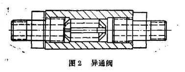 在氣缸下部進出口處安裝一只降噪異通閥,此閥進氣時由于阻尼作用,能夠控制啟動氣流量,排氣時則自動轉換成正常通路。同時,活塞下部氣缸間的空間容積盡可能變 小。在這二個條件同時具備情況下,當楔式閘板受活塞和閥桿推力開動》活塞快速移動一小距離時,其下部空間壓力隨即變小,甚至產生瞬時負壓。從而可減小或避免氣流沖九達到降噪目的。見圖1。為了降低開閥噪聲我所自制了一只降噪異通閥(見圖2),用于氣動閘閥壽命試驗氣路上,試驗中對閥門啟動有較好的減噪作用。由于當時受試驗用閥門的氣動構件設計制造情況所限,其實際空間容積 VG較大,上述二個條件中小的條件不滿足,因而降噪程度還未能達到要求。筆者認為,如果進一步降低VG,則降噪效果將會提高。