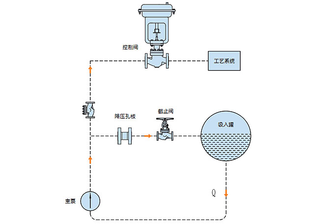 連續循環系統泵的最小需求流量與系統的工藝流量變化無關。最小流量設定好后經過減壓孔板直接回流至儲罐,連續的最小流量循環雖然可以很好的保護泵,但是必須泵提供更大輸出功率以保證系統工藝流量加上再循環流量,造成額外的能源浪費。